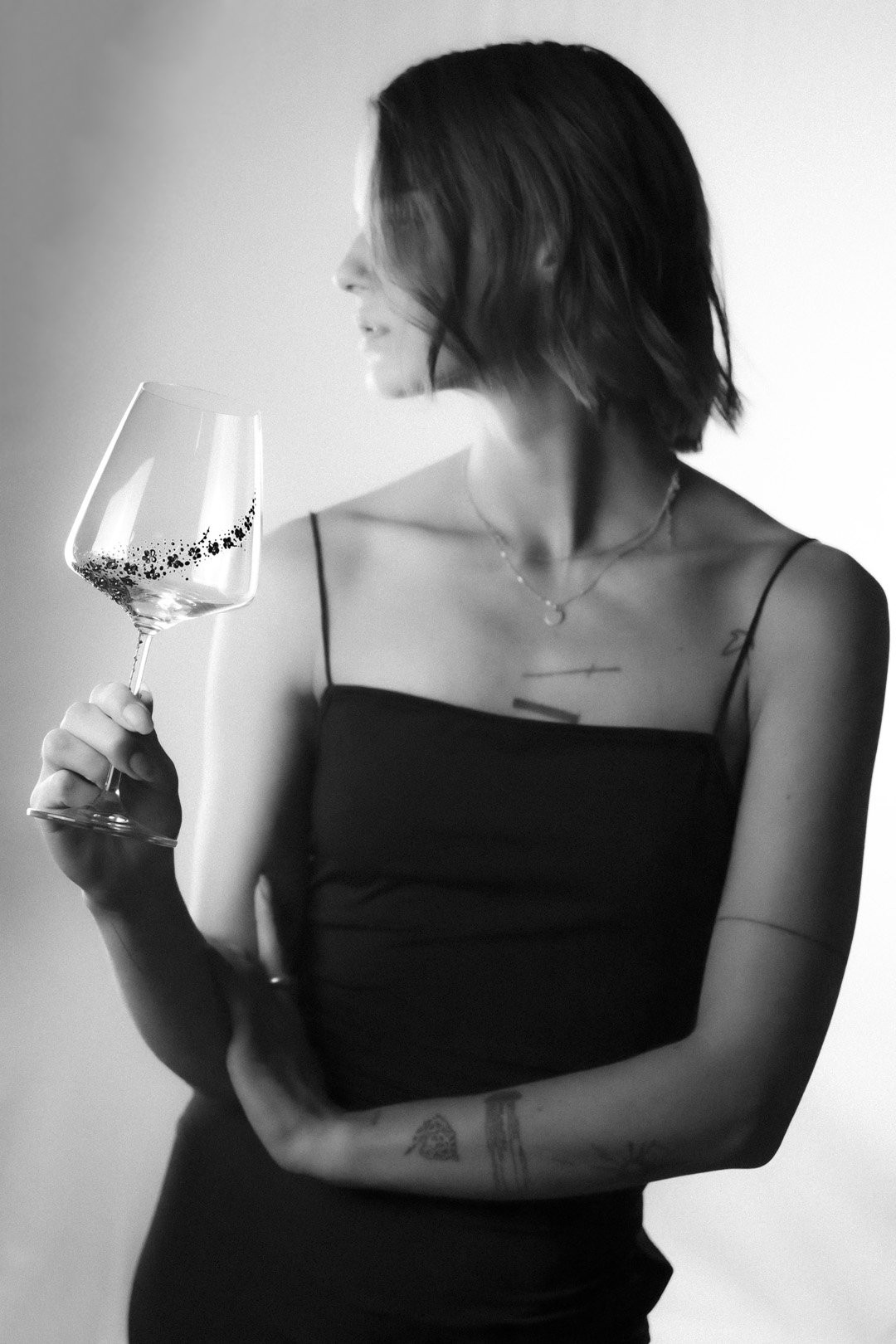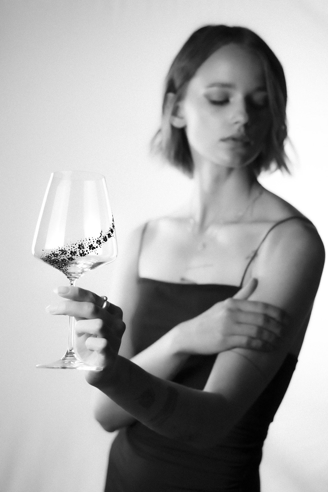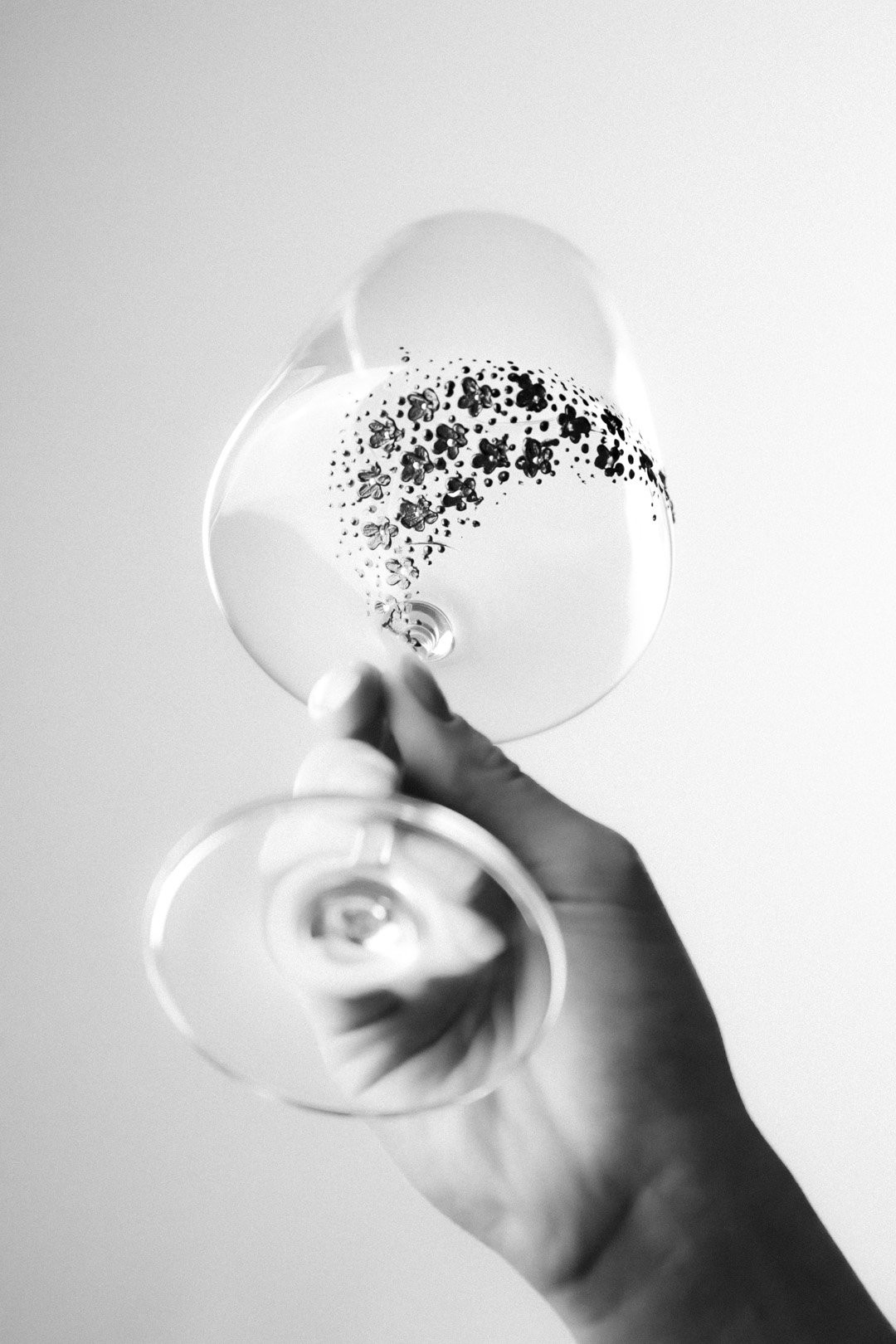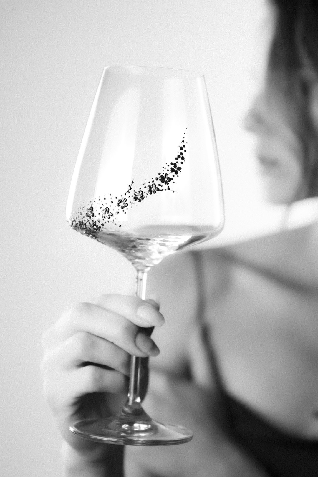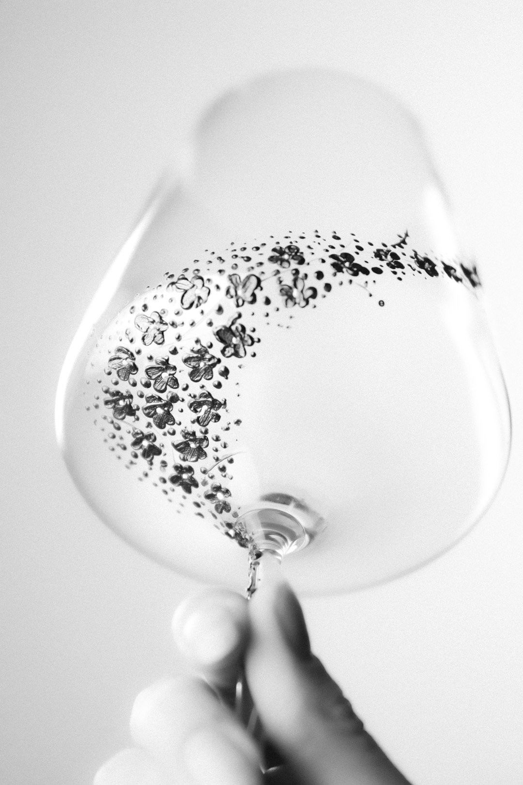 Sklenice na víno Veil je zdobena jemnými černými květy, které jsou ručně malovány vysokým smaltem a vytvářejí elegantní design. Tato nádherná dekorace jemně rozsplývá podél sklenice a nabízí dotek rafinované krásy při pití.