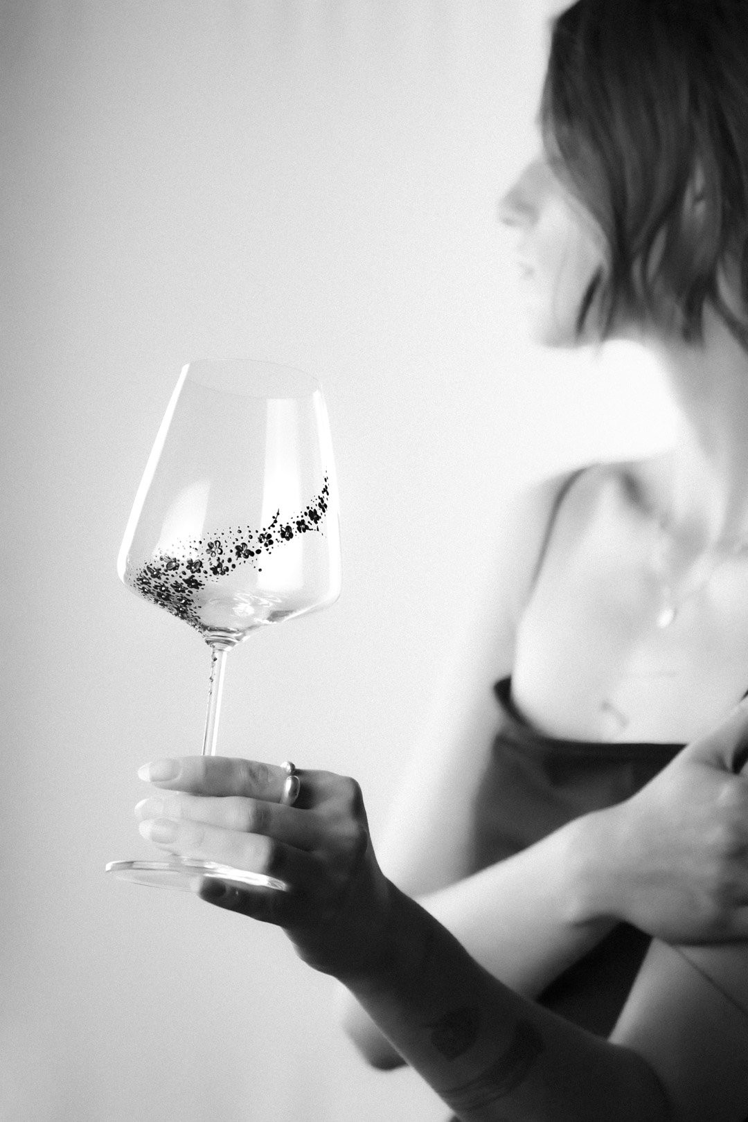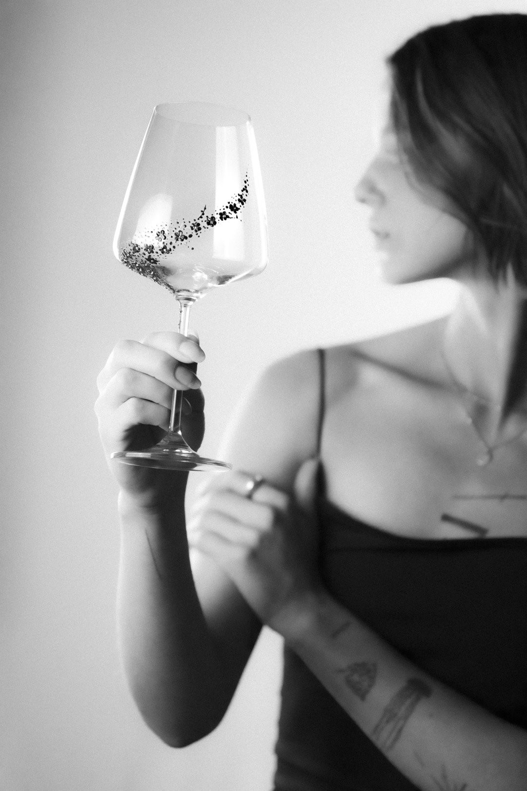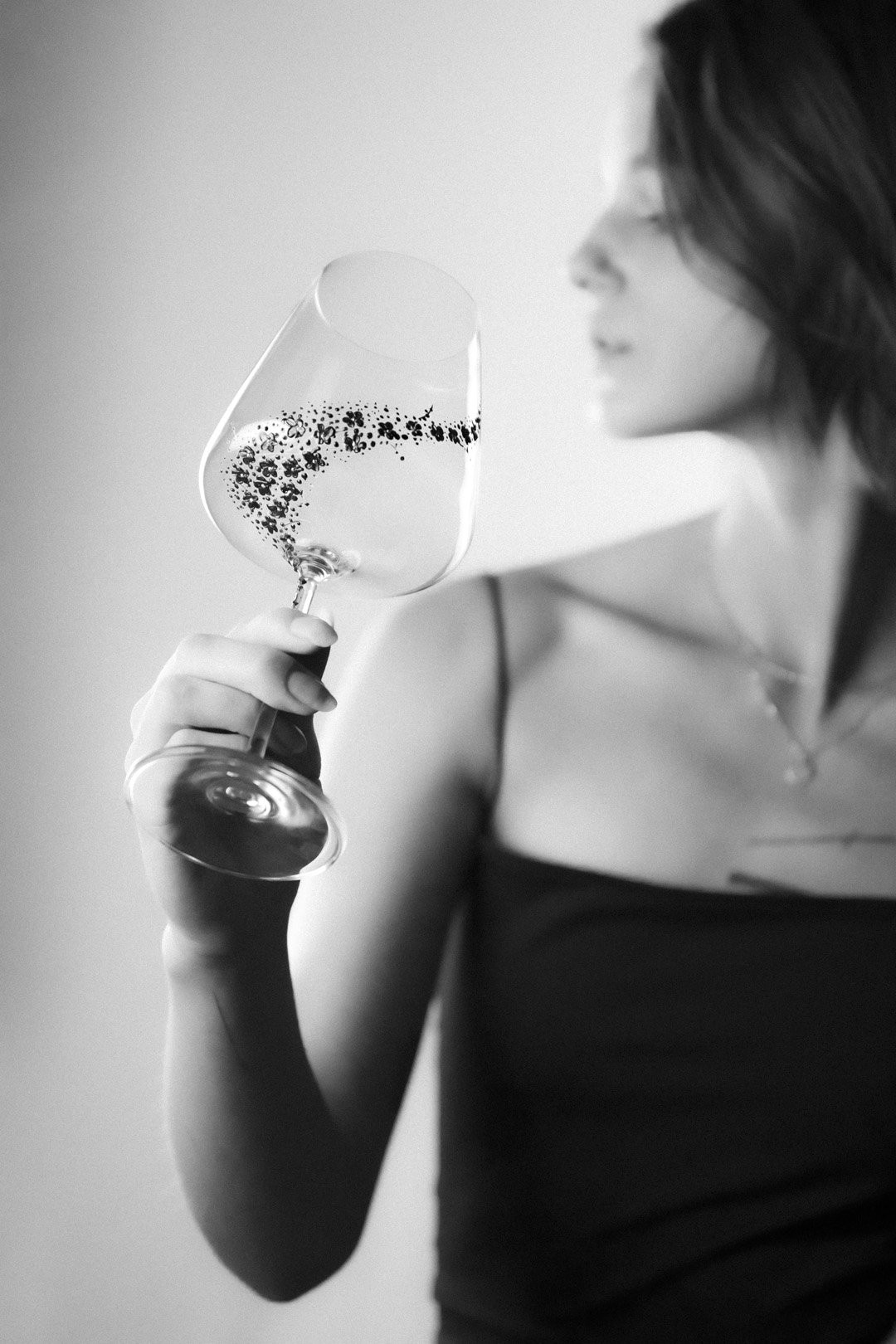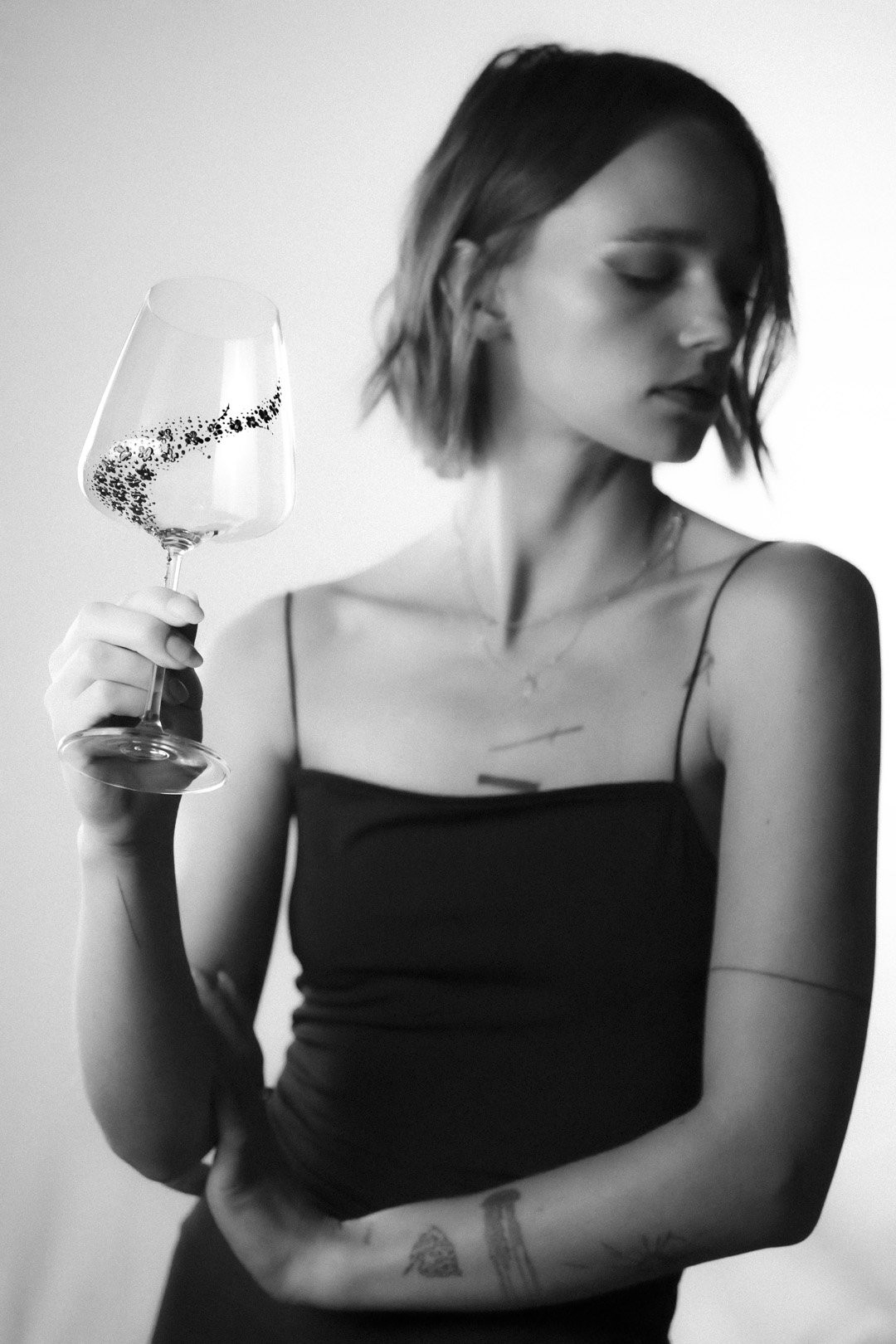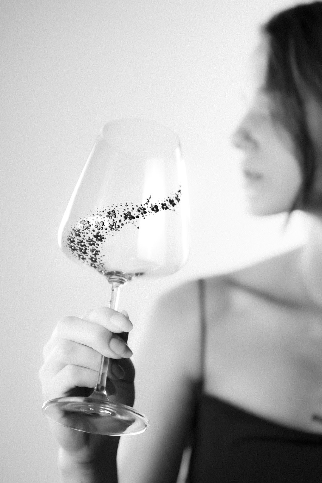 Sklenice na víno Veil je zdobena jemnými černými květy, které jsou ručně malovány vysokým smaltem a vytvářejí elegantní design. Tato nádherná dekorace jemně rozsplývá podél sklenice a nabízí dotek rafinované krásy při pití.