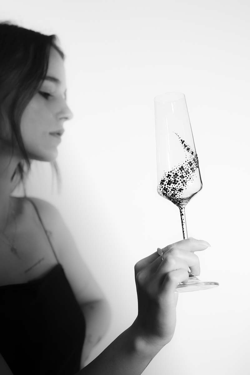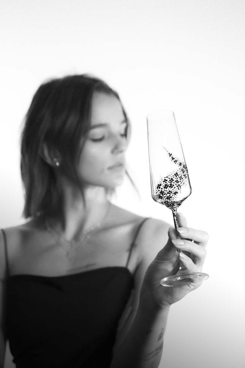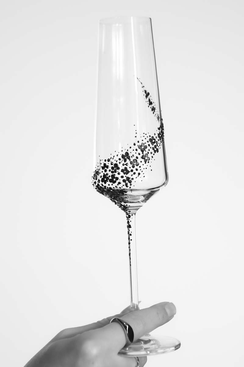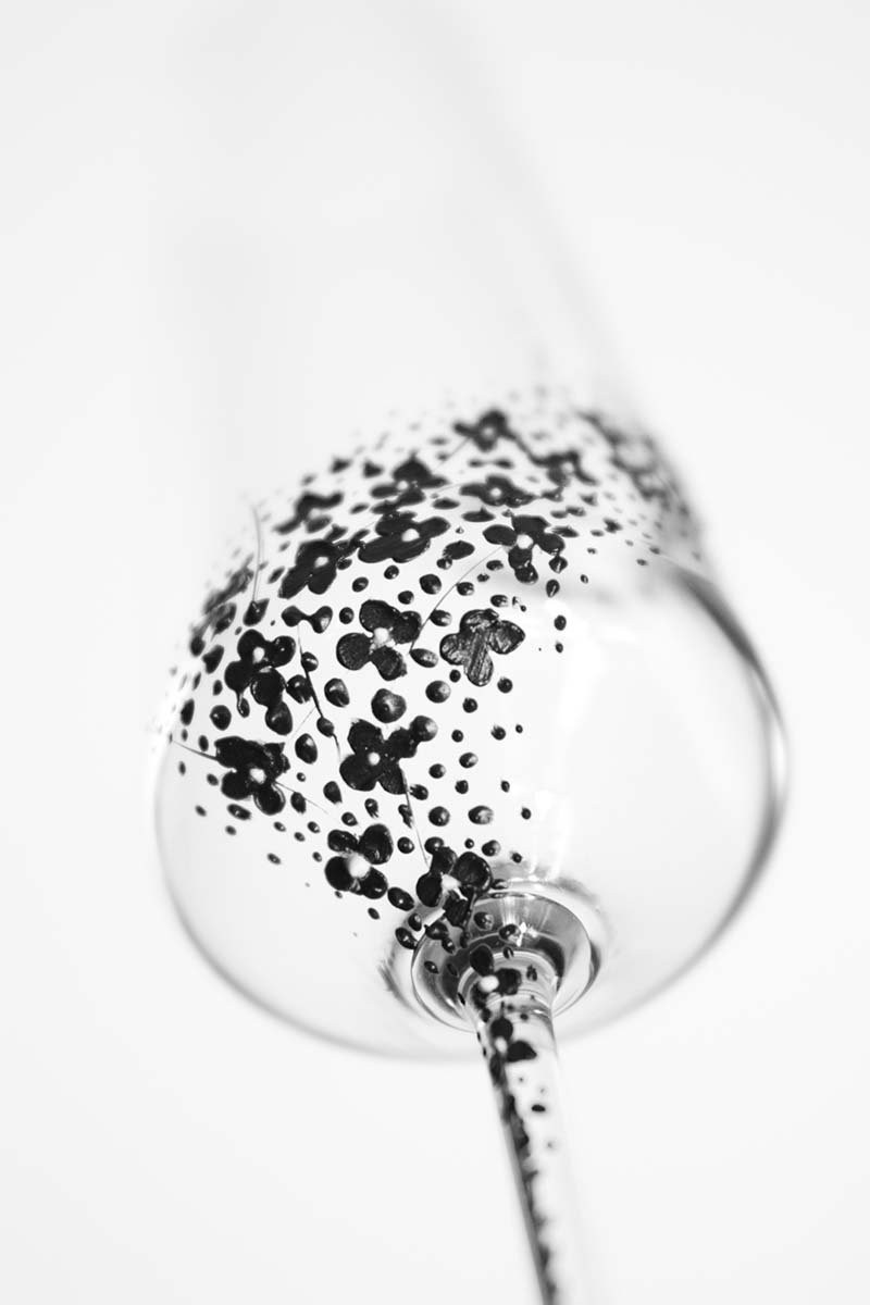 Sklenice na víno Veil black je zdobena jemnými černými květy, které jsou ručně malovány vysokým smaltem a vytvářejí elegantní design. Tato nádherná dekorace jemně rozsplývá podél sklenice a nabízí dotek rafinované krásy při pití.