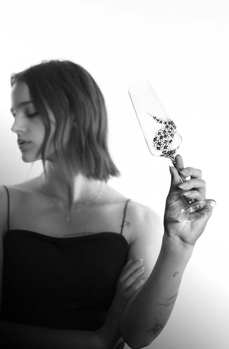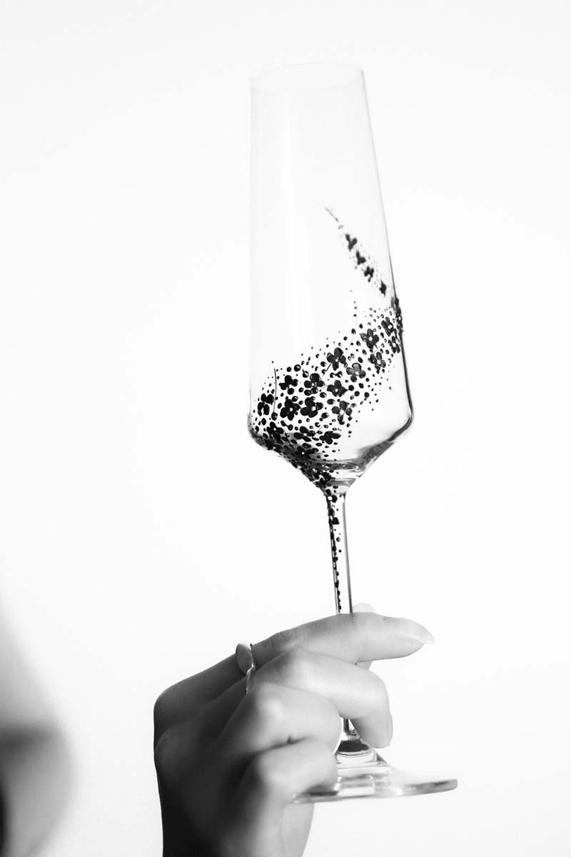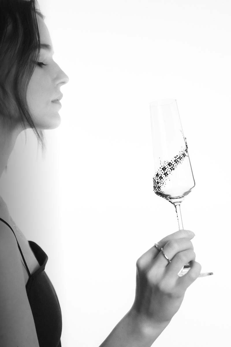 Sklenice na víno Veil black je zdobena jemnými černými květy, které jsou ručně malovány vysokým smaltem a vytvářejí elegantní design. Tato nádherná dekorace jemně rozsplývá podél sklenice a nabízí dotek rafinované krásy při pití.