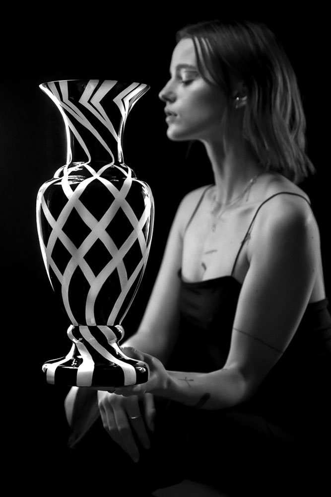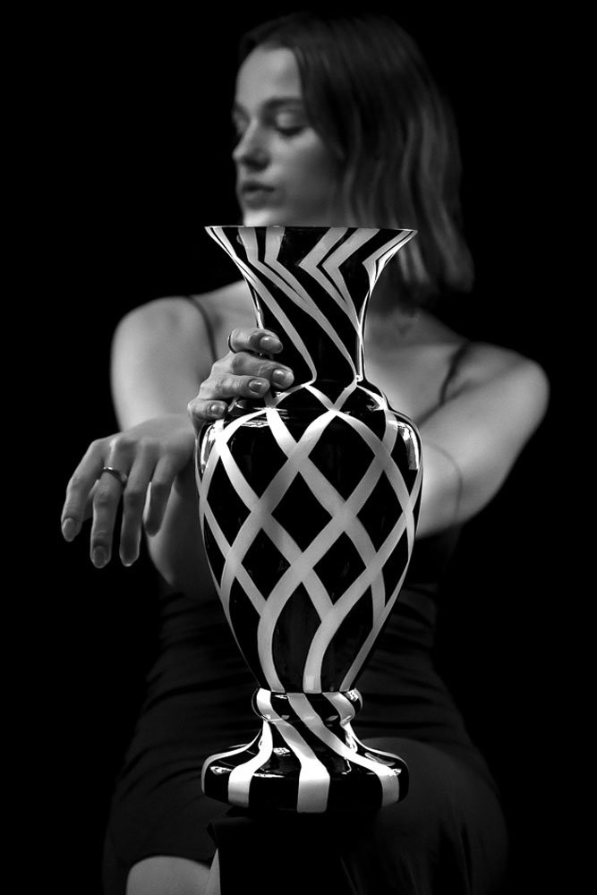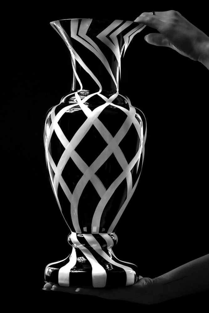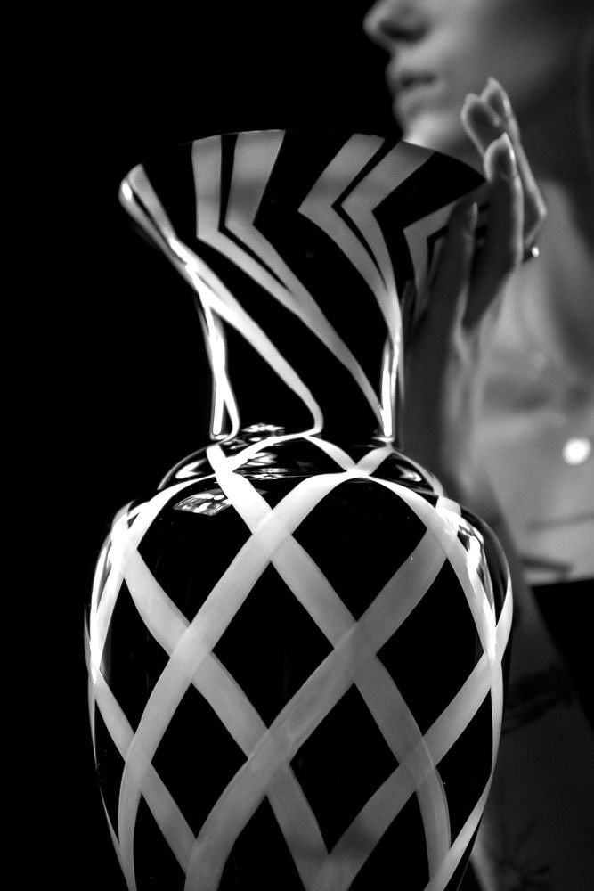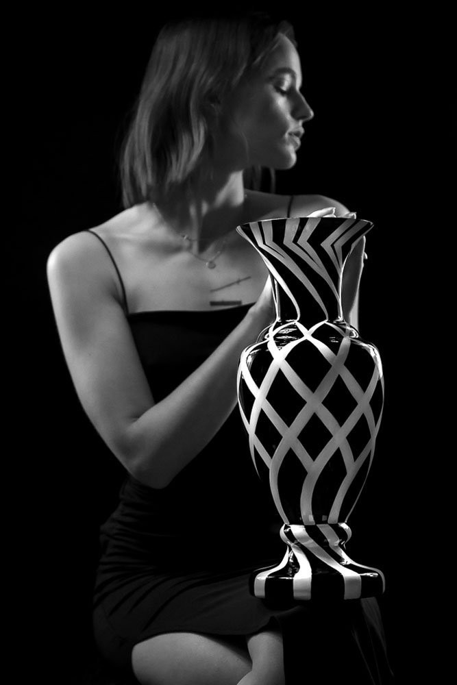 Vytvořte si pomocí české designové vázy nadšasový interiér. Ručně foukaná váza v temně černé barvě a má na výšku až 40 cm. Její velkou výhodou je, že i bez květin poutavě vyniká na zvoleném místě. Vortex byl inspirován vodním vírem. Bílý dekor, jako její doména, je ručně točivě malovaný od spodní až k horní části vázy.