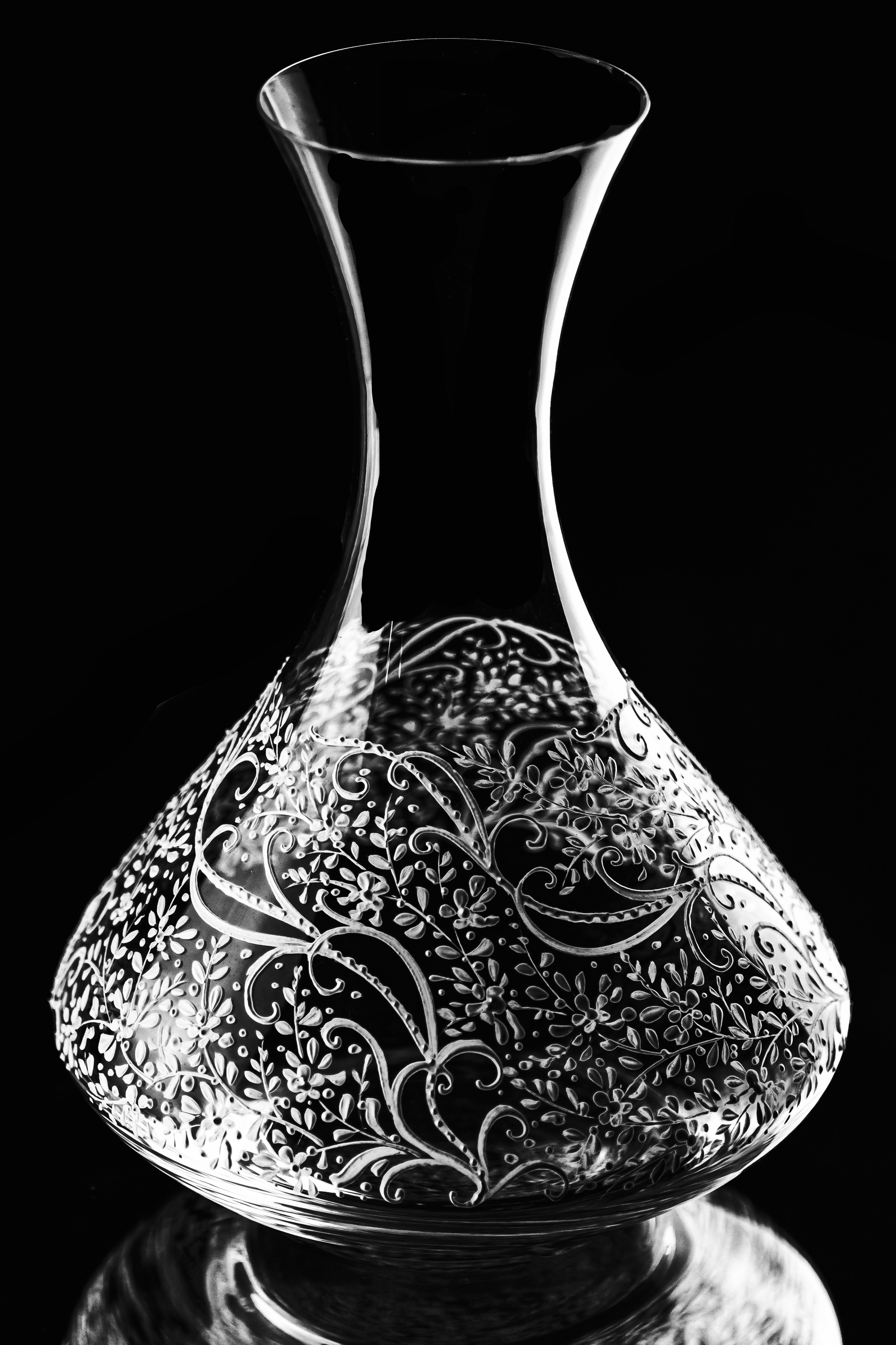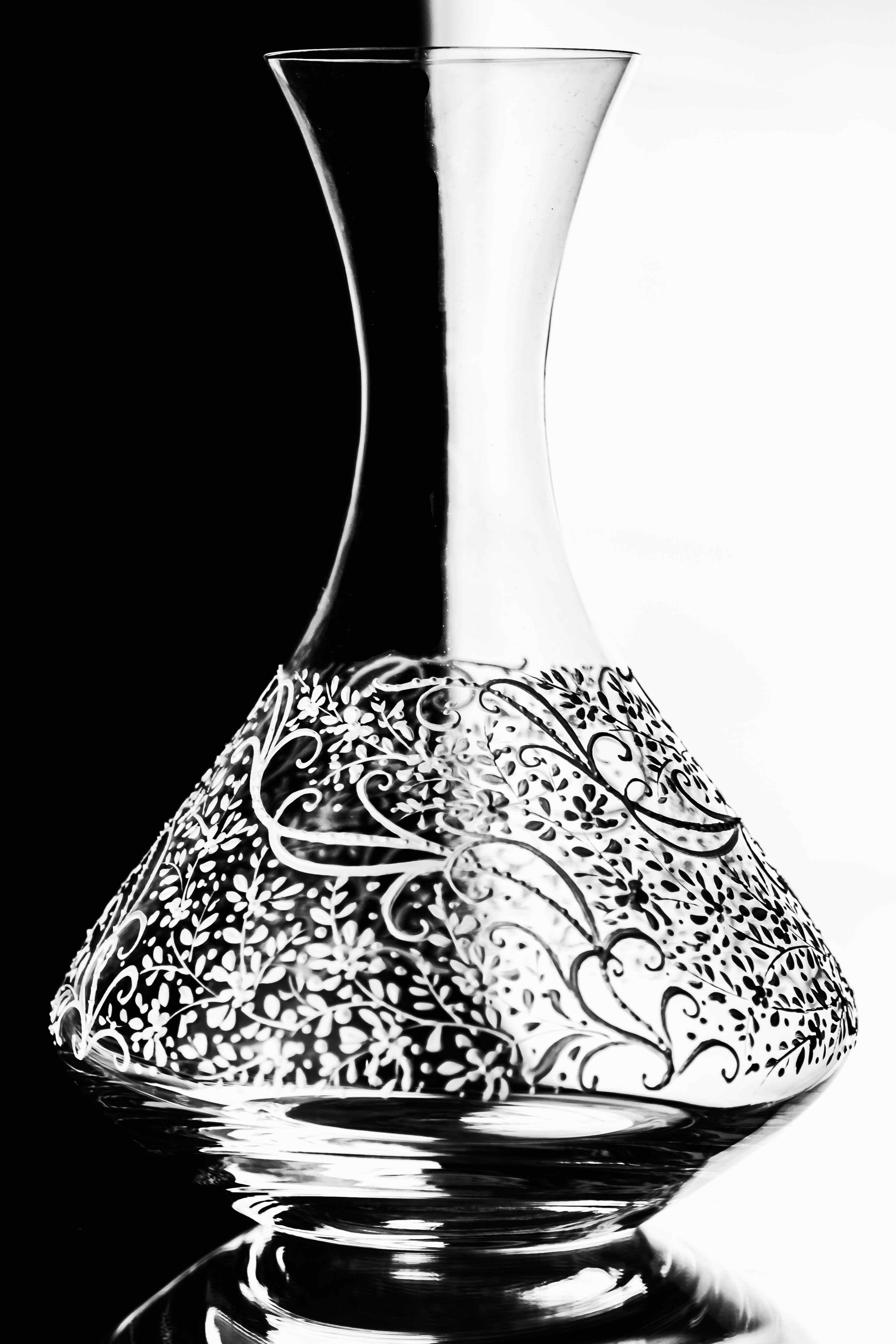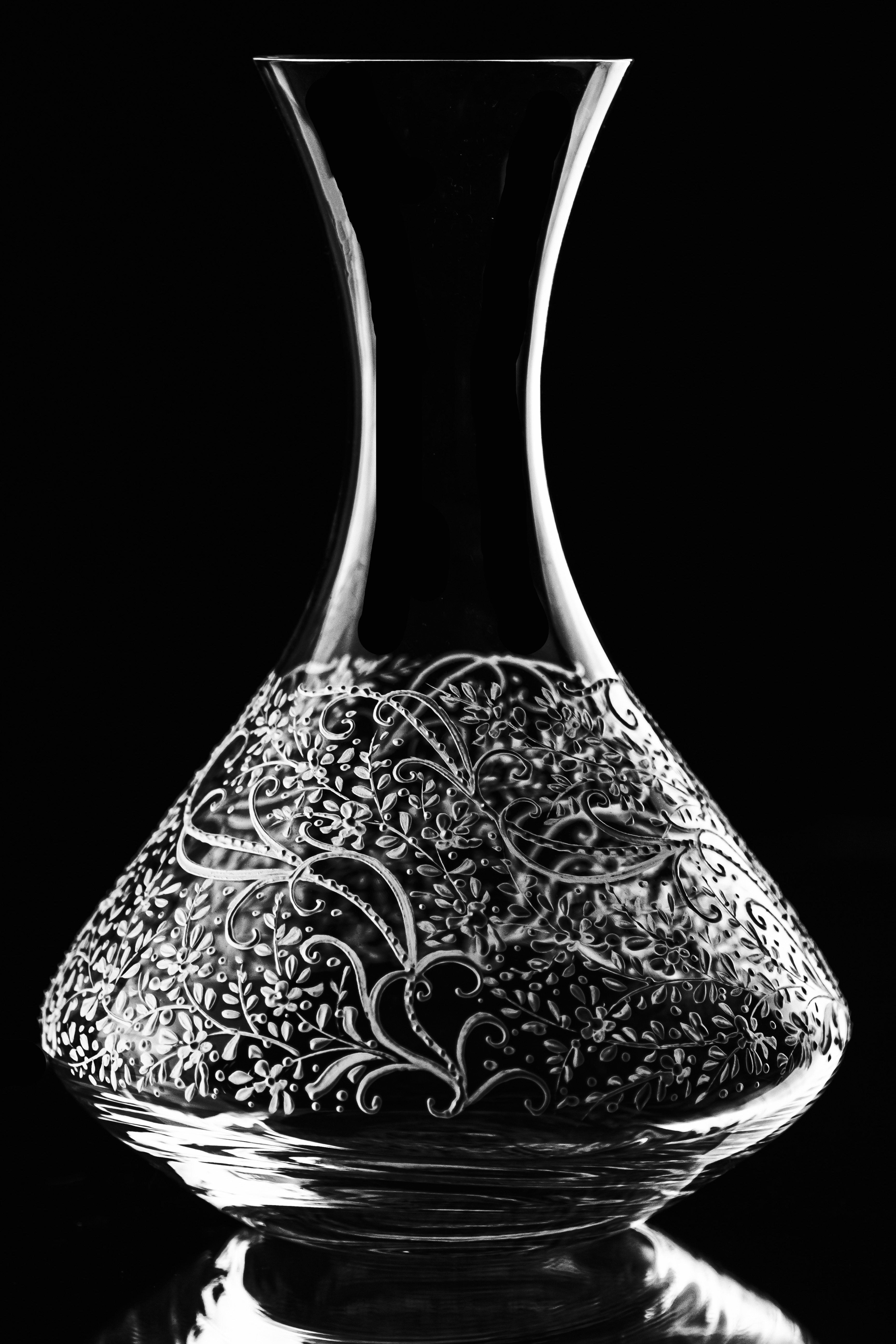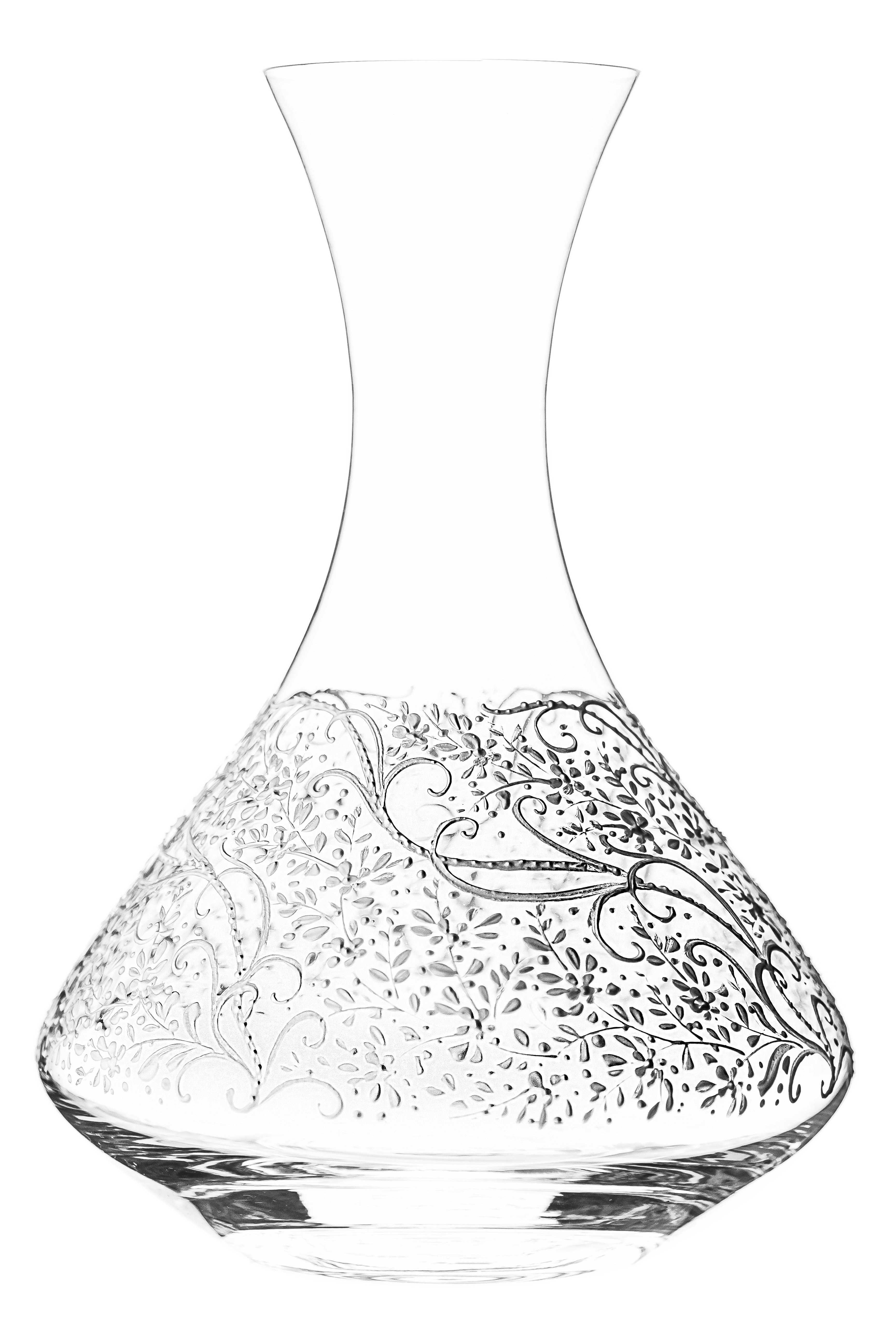Precizní ručně malovaná reliéfní dekorace na dekantér na víno. I takto by se dala popsat tato úchvatně romantická bílá malba, která jen tak nedovolí člověku odvrátit zrak. Naopak ho vtáhne do svých elegantně tvarovaných křivek.