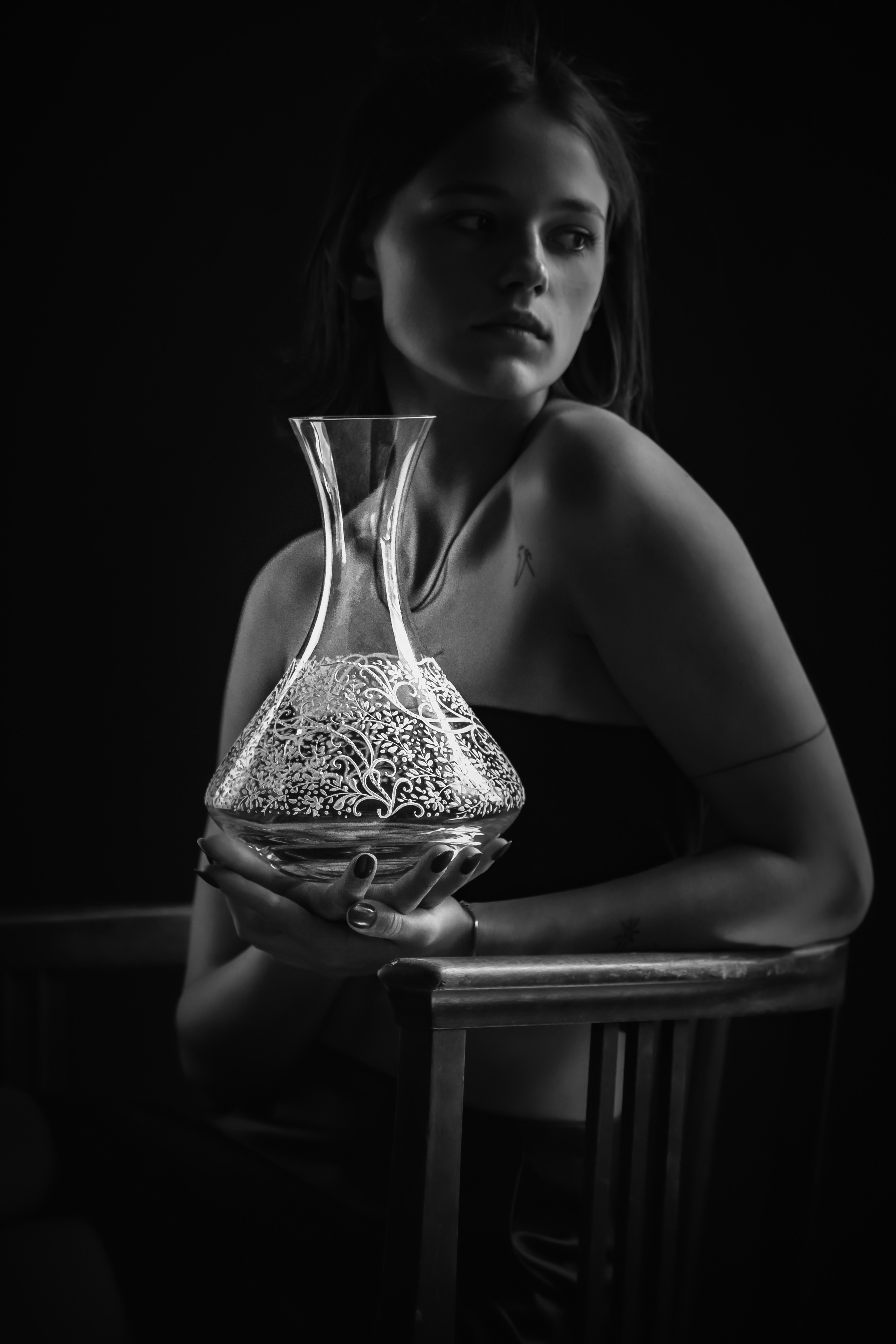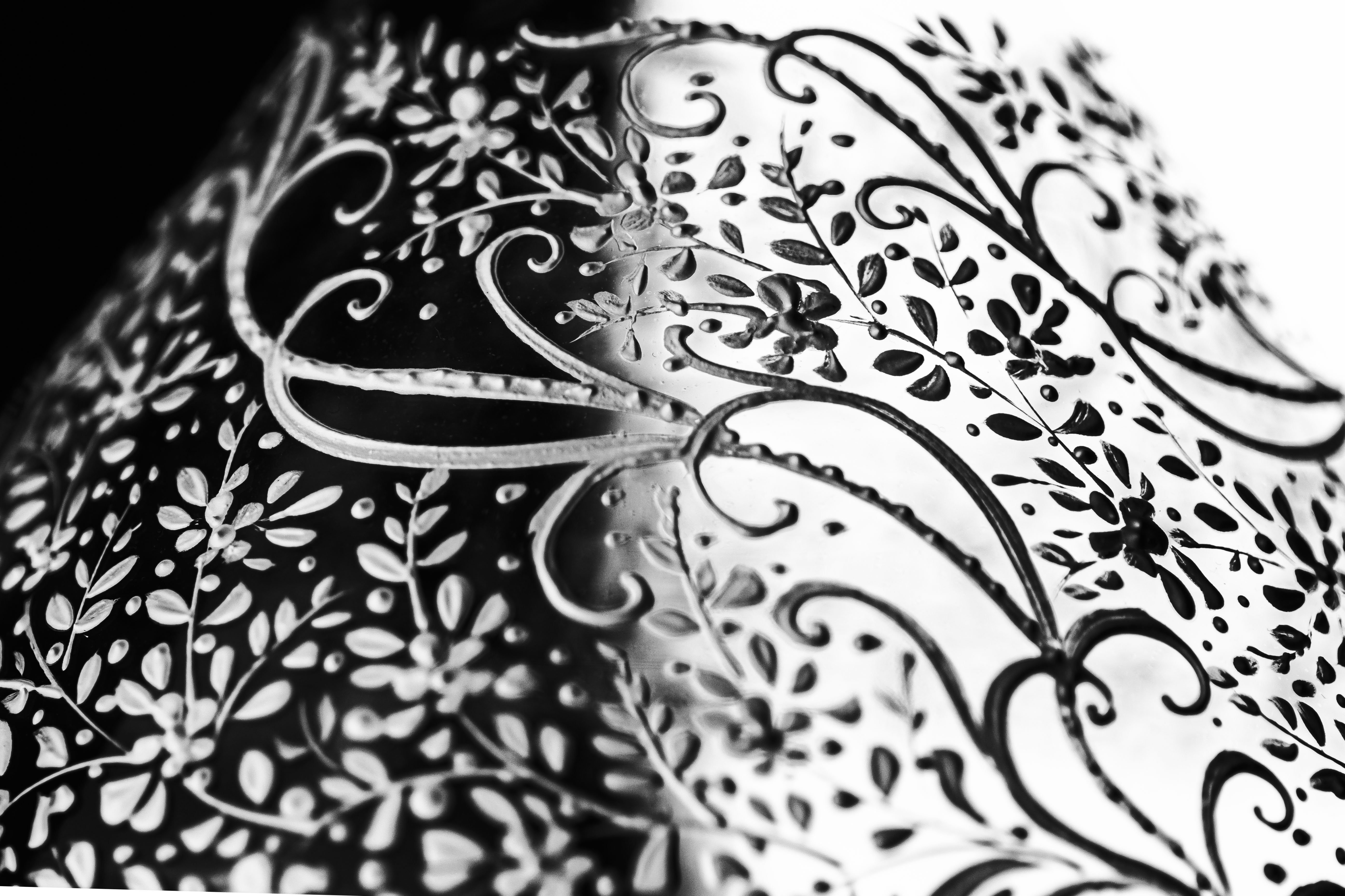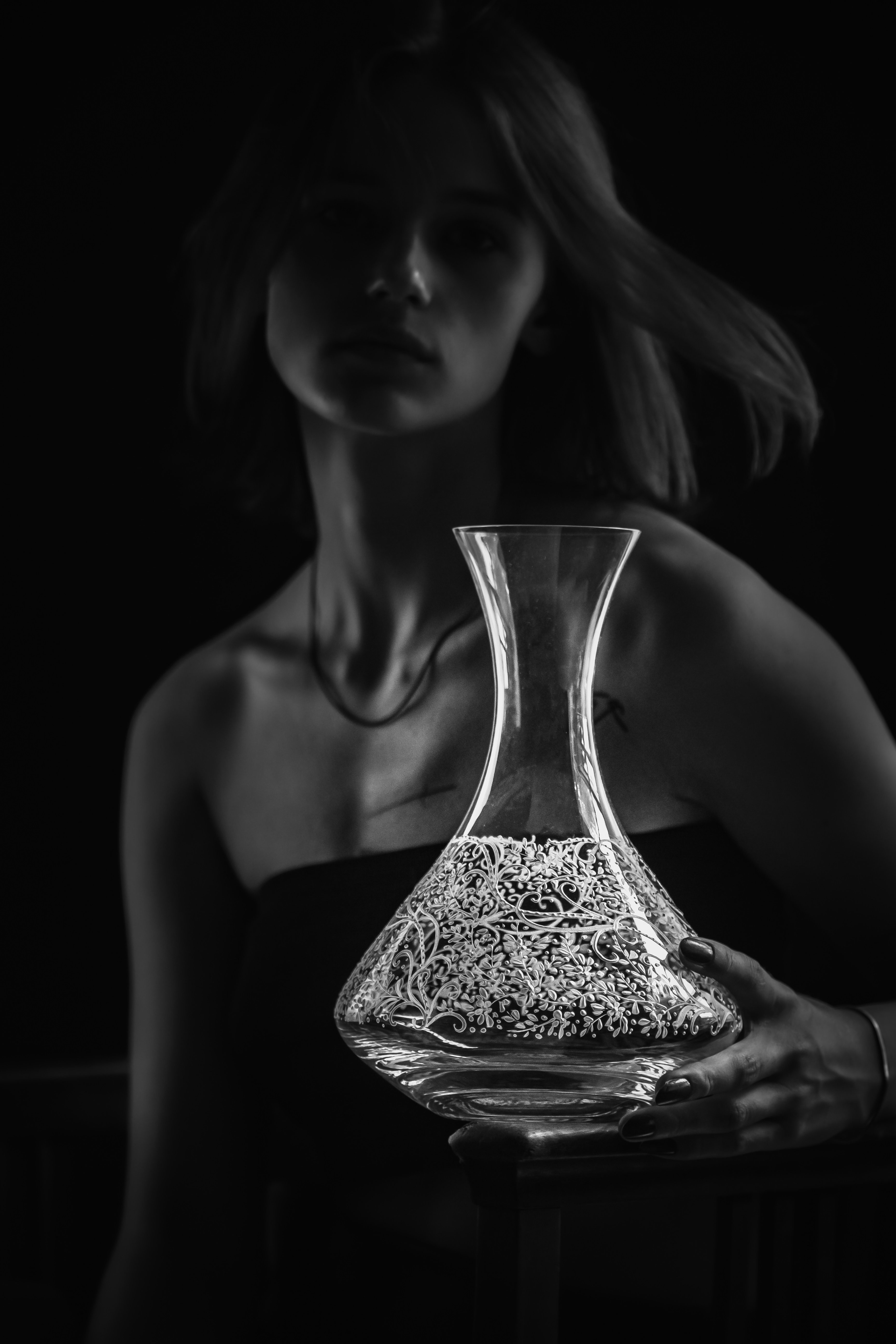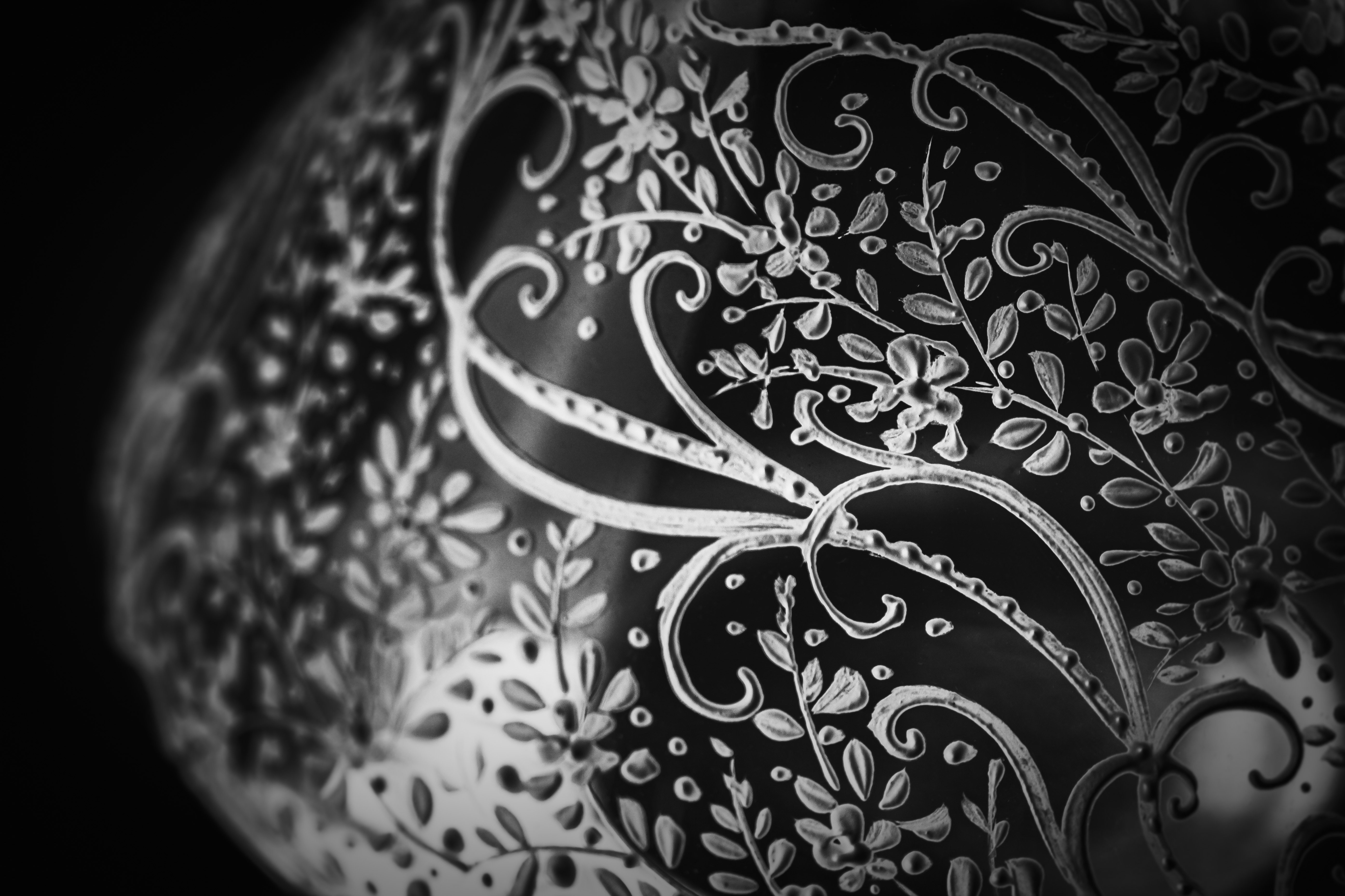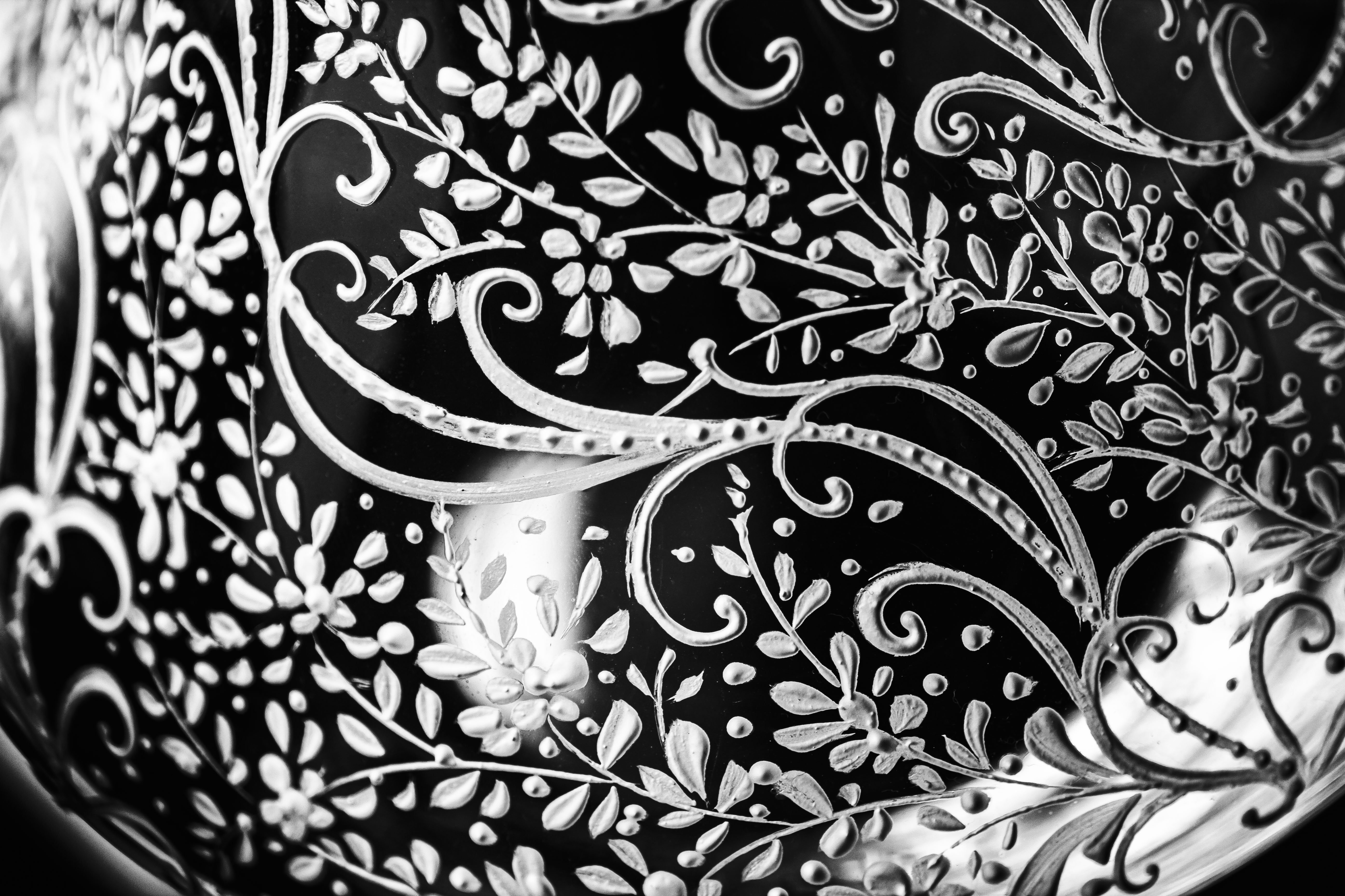 Precizní ručně malovaná reliéfní dekorace na dekantér na víno. I takto by se dala popsat tato úchvatně romantická bílá malba, která jen tak nedovolí člověku odvrátit zrak. Naopak ho vtáhne do svých elegantně tvarovaných křivek.