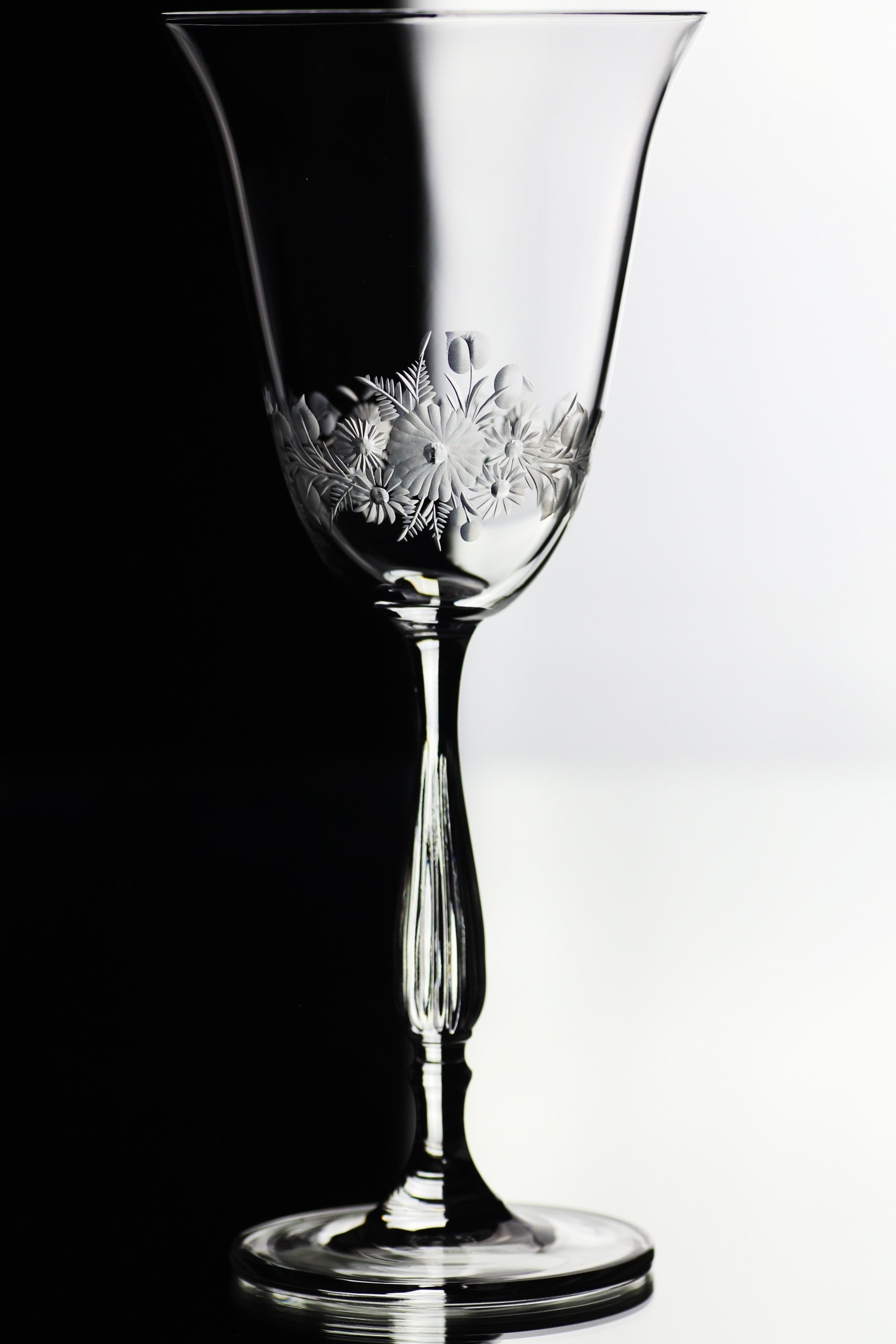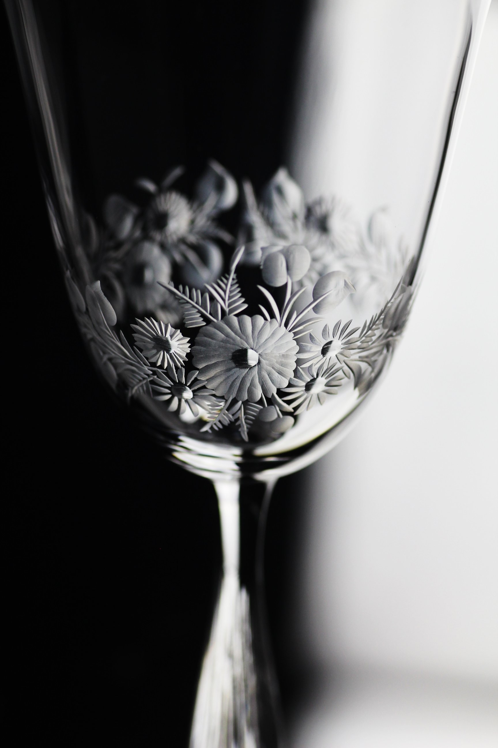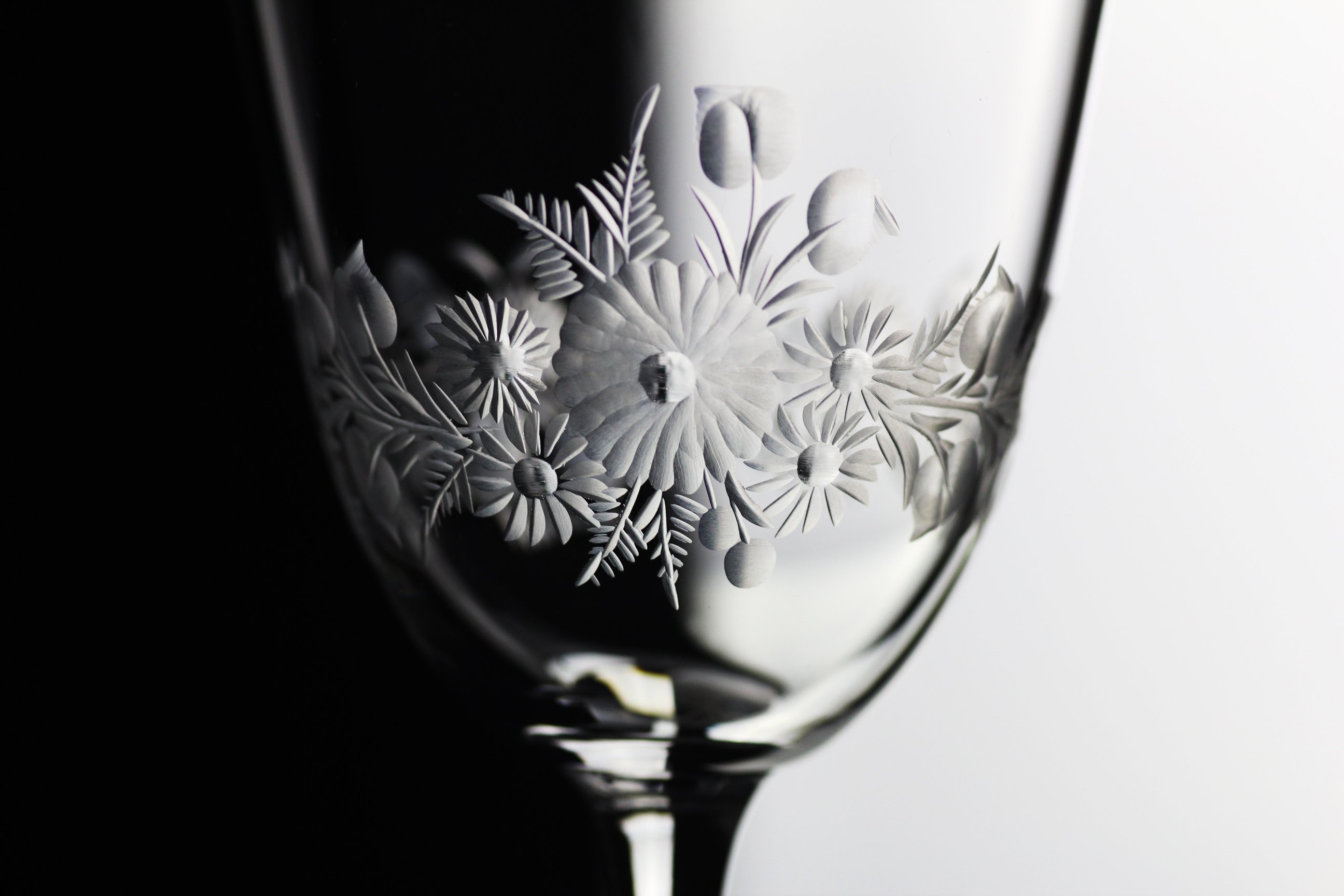 Zvonkový tvar kalichu, zdobná nožka – co zbývá – snad už jen jemný rytý detail věnečku z drobných kvítků. Tento rozkošný motiv působí spíše jako šperk v podobě prstenu.