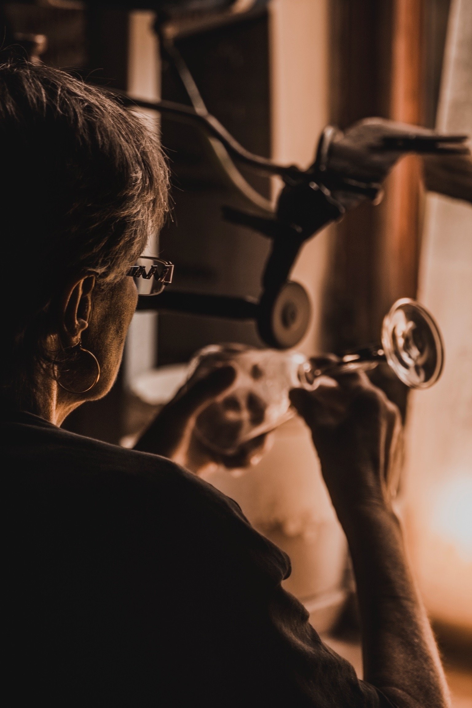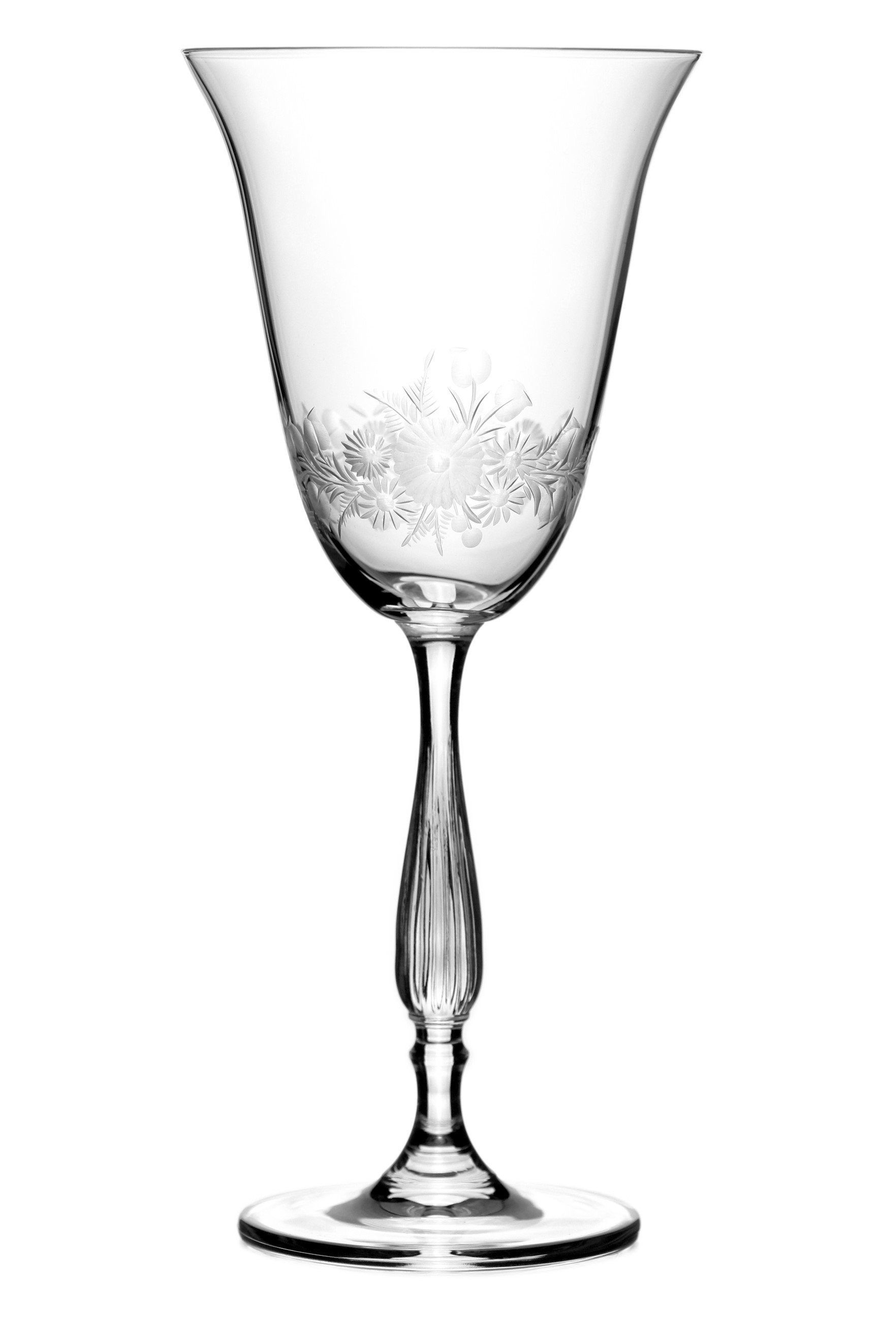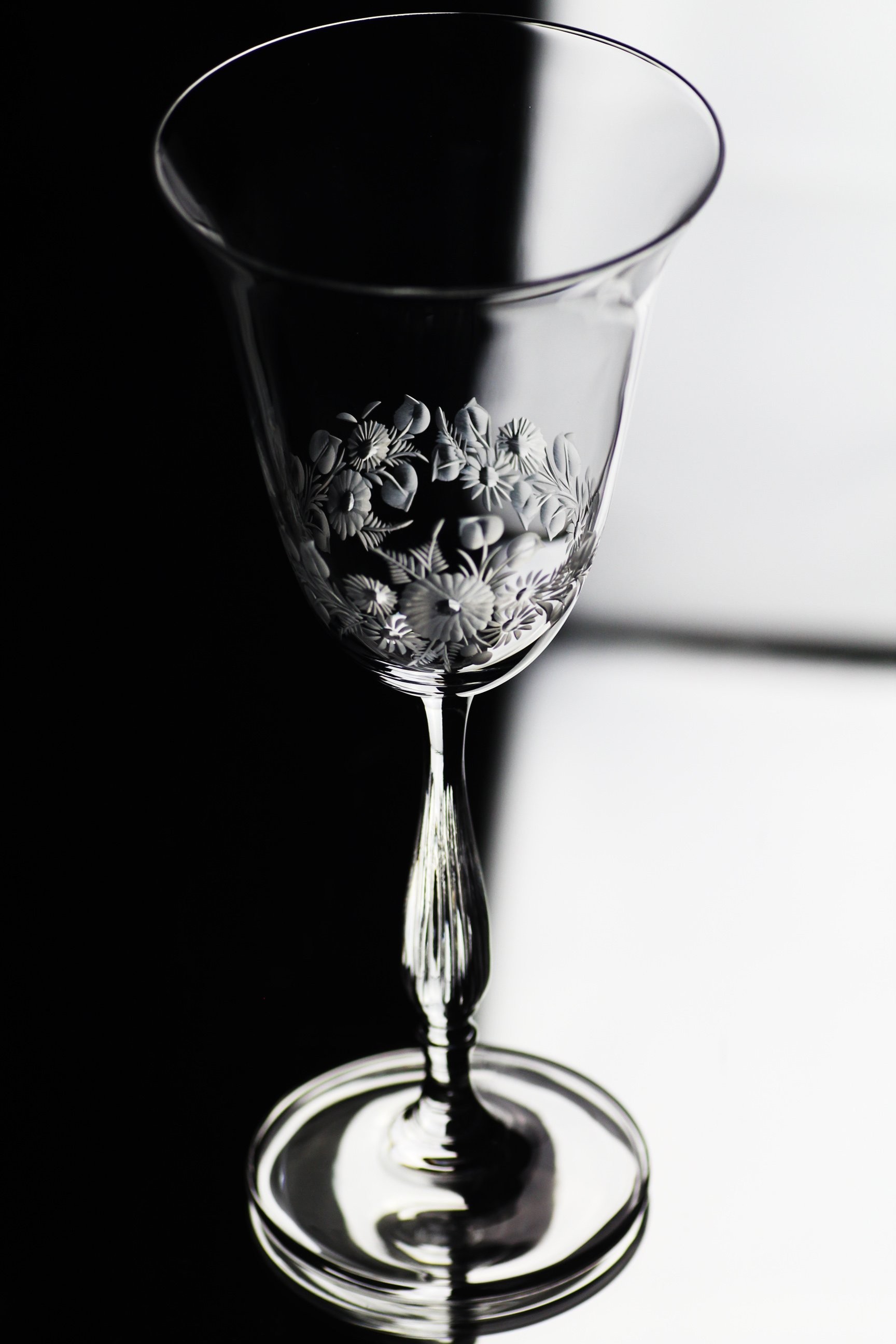 Zvonkový tvar kalichu, zdobná nožka – co zbývá – snad už jen jemný rytý detail věnečku z drobných kvítků. Tento rozkošný motiv působí spíše jako šperk v podobě prstenu.